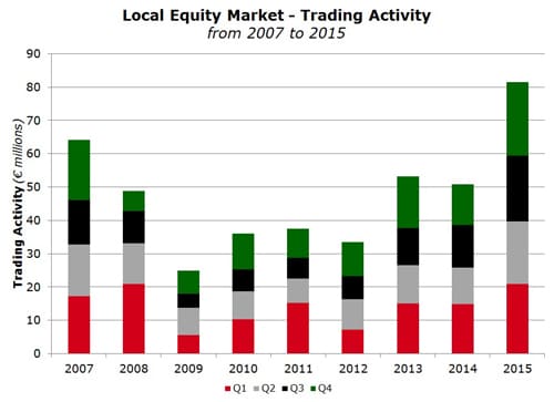 The MSE Share Index rallied by 33% during the past 12 months – the best performance since 2005. Trading volumes across the equity market surged by 60.5% over the previous year to €81.5 million. This is the highest level of turnover across the equity market since 2006.