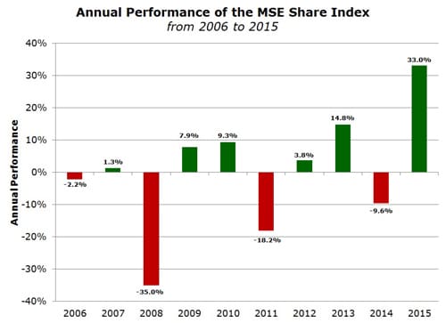 2015 can best be described as a truly exceptional year for the Maltese equity market. This is not only due to the 33% gain in the MSE Share Index which is by far well above the performances of the main global equity markets including all the markets across the Eurozone with the exception of Latvia which posted an increase of 45.7%. In my view, 2015 is also extraordinary given the extent of the positive performances across most equities. Three companies saw their equities more than double in value during the past 12 months with a further 9 companies registering an increase of more than 40%. Among the 21 equities on the Official List of the Malta Stock Exchange, only one company performed negatively. This was GlobalCapital plc with a drop of 6%.